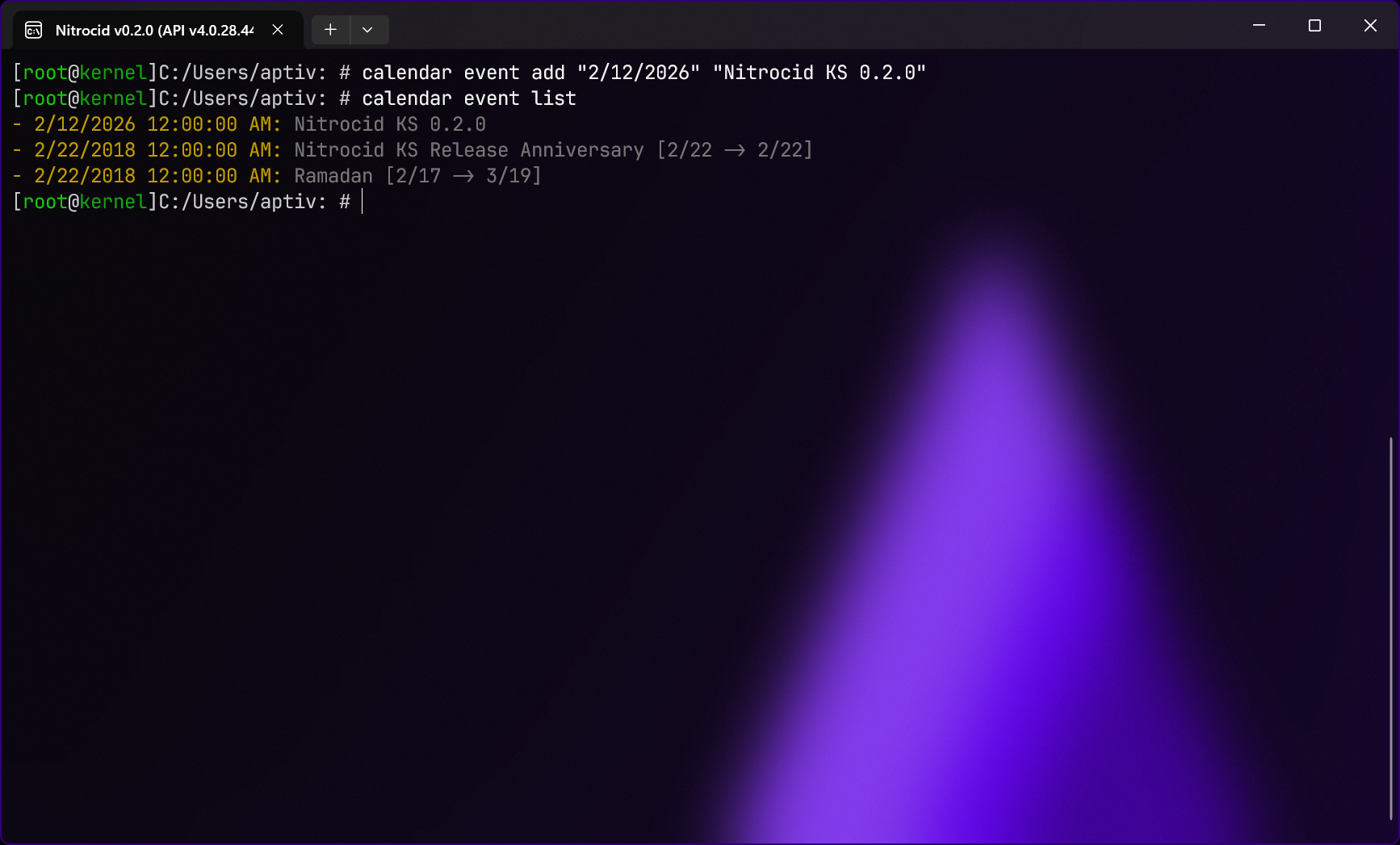 * `calendar <reminder> <add> <dateandtime> <title>`