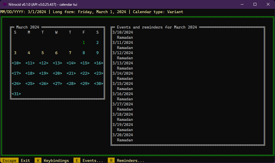 In addition to providing the calendar command in the addon, the base Nitrocid API provides some of the calendar management APIs to make access to them easier than before. You can now get the calendar straight from the calendar type or its name using the GetCalendar() function from the CalendarTools class.
