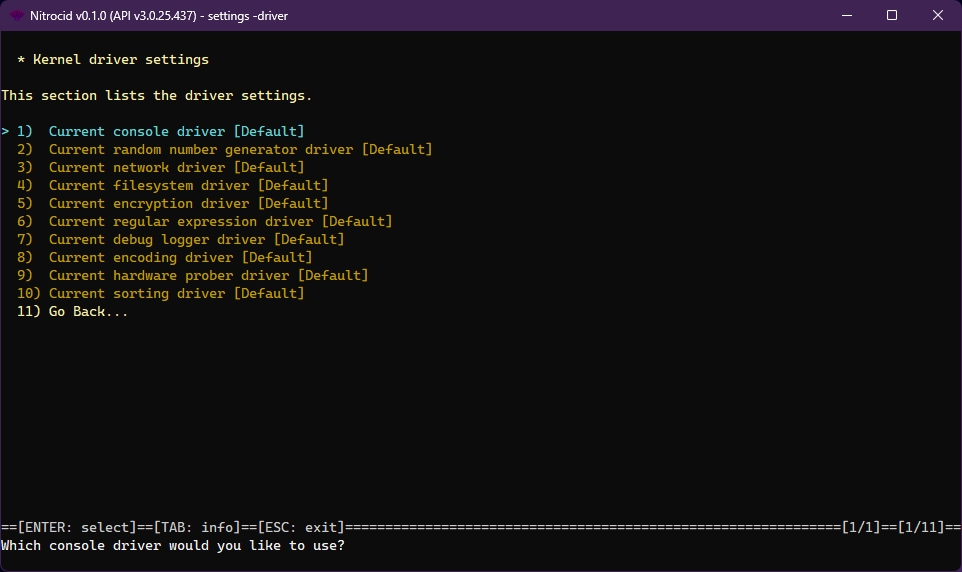 In order to configure your driver, select one of the driver types from the settings section shown above by pressing ENTER, and select your driver.