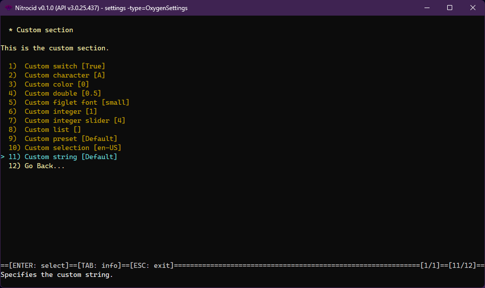 Customized settings give you an ability to leverage the built-in settings application provided by the Nitrocid base system to customize your mod's behavior. These settings are saved to your kernel configuration directory as JSON files under the class names for easy recognition.