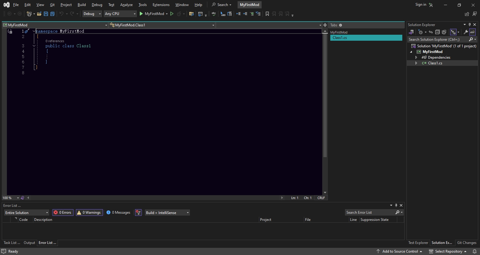 10. Now, implement everything as you wish. Once you're done, follow the steps on how to create a strong name signing key and sign your mod. Then, click on the Build menu and select Build Solution.