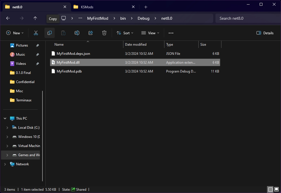 12. Navigate to the output directory and copy the .dll file to KSMods under the %localappdata%/KS folder.