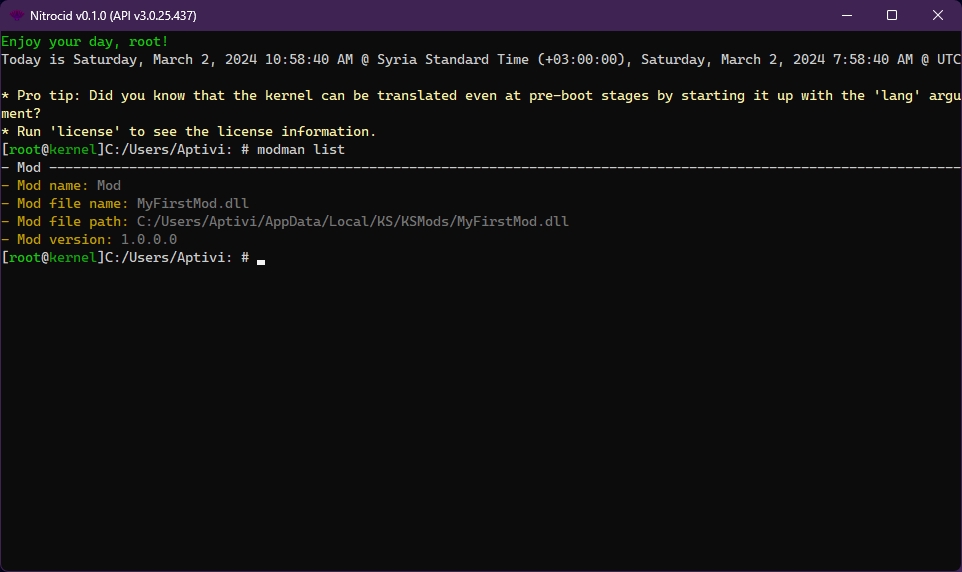 13. Open Nitrocid KS to test your mod. Ensure that modman list lists your mod.
