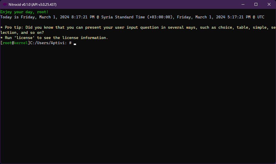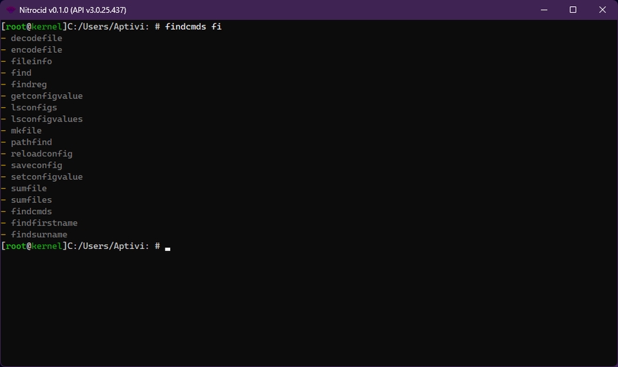 All of the shells contain their own commands that you can review on either the help command list (depending on the mode used, such as -addon for addon commands) or the below page (just for Nitrocid shells, base shell, and Addon commands):
