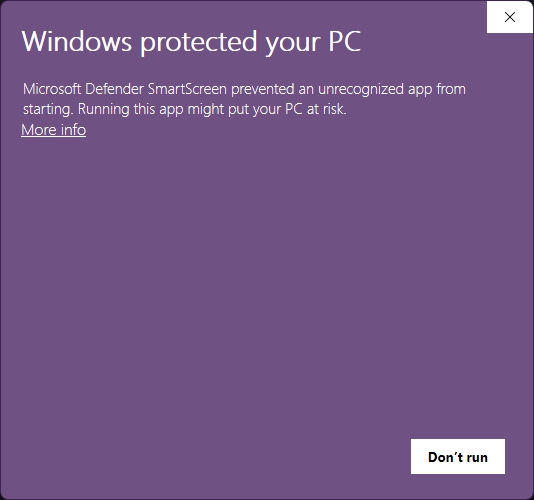 SmartScreen may detect that the Nitrocid and its associated executables may not pass the SmartScreen attestation. If this happens, you'll see the below page: