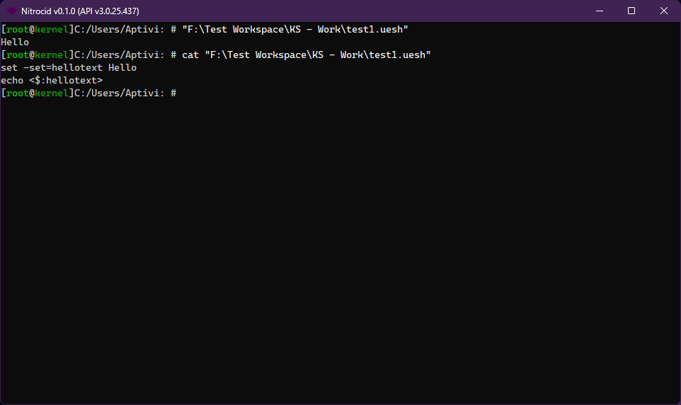 UESH shell contains scripting support. The shell scripts have the `.uesh` extension containing a subset of UESH commands inside it. A simple UESH script containing a command that sets a UESH variable is as follows: