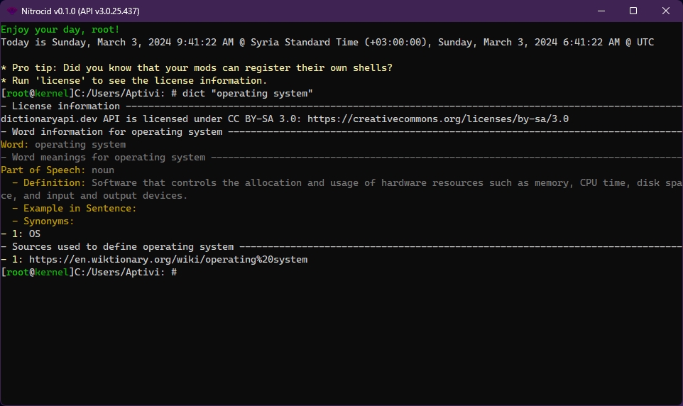 Nitrocid KS features a dictionary supplied as a separate addon to allow you to get a definition of an English word. You can define a word of your choice, as long as it's found in the back end, which is the Free Dictionary API.