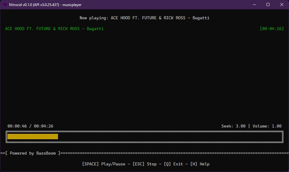 Powered by BassBoom, Nitrocid KS provides an addon which hosts audio-related programs, such as the interactive music player and the simple sound player. This page talks about both, which allow you to play sound files.