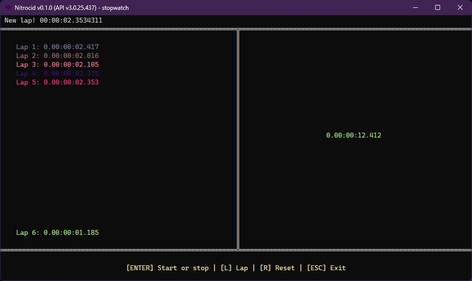 ENTER: Starts counting up the time or stops the entire stopwatchL: Sets the lap on the current elapsed timeSHIFT + L: Shows a complete list of laps in an infoboxR: Resets the stopwatch and its lapsESC: Exits the application