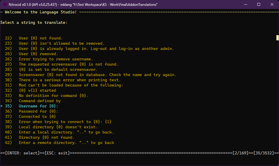 Custom LanguagesOnce you point mklang to a directory containing these files, you'll be taken to a screen that allows you to select an English string to be translated. You can select one of them by moving up or down and pressing ENTER. Then, you'll be provided with a list of languages and their translations like below: