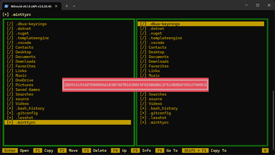 However, if you want to select a directory to navigate to by selecting a directory, you can press F6 to open up another interactive TUI that allows you to navigate to folders and select the desired folder. Pressing Spacebar on a folder causes you to select a folder that you want to open. If you want to open a folder using just a path or if you want to go to another drive, you can use F6 to open an interactive input infobox that allows you to write a full path to a desired directory.
