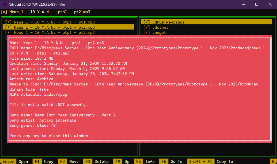 However, if you press F5 on a selected file, you'll be able to get the following information: