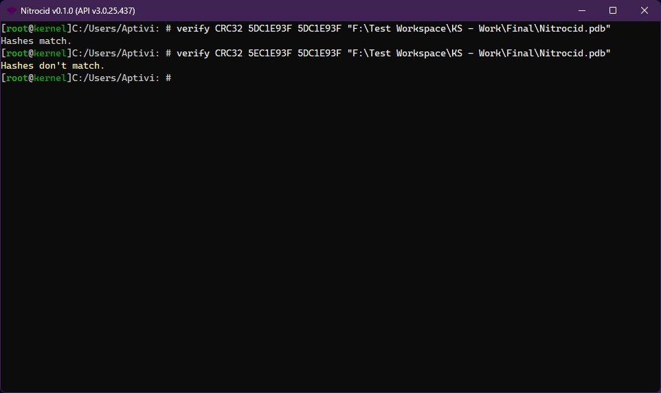 When it comes to verifying the file integrity, the file hashing feature of Nitrocid KS's simulated filesystem comes into play. It features built-in file hashing techniques to allow you to check the sanity of your files. The kernel file encryption features are handled by your selected encryption kernel driver, which can be found here: