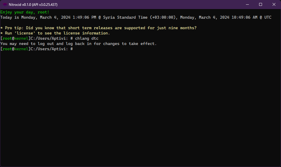 You can use chlang with the -usesyslang switch to change your kernel language to a language that Nitrocid detects based on your UI language set by your operating system.