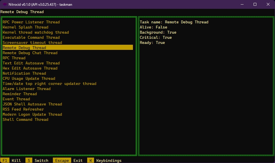 in the normal shell. It allows you to list both the Nitrocid KS threads and the unmanaged operating system threads, and it provides you with their information.