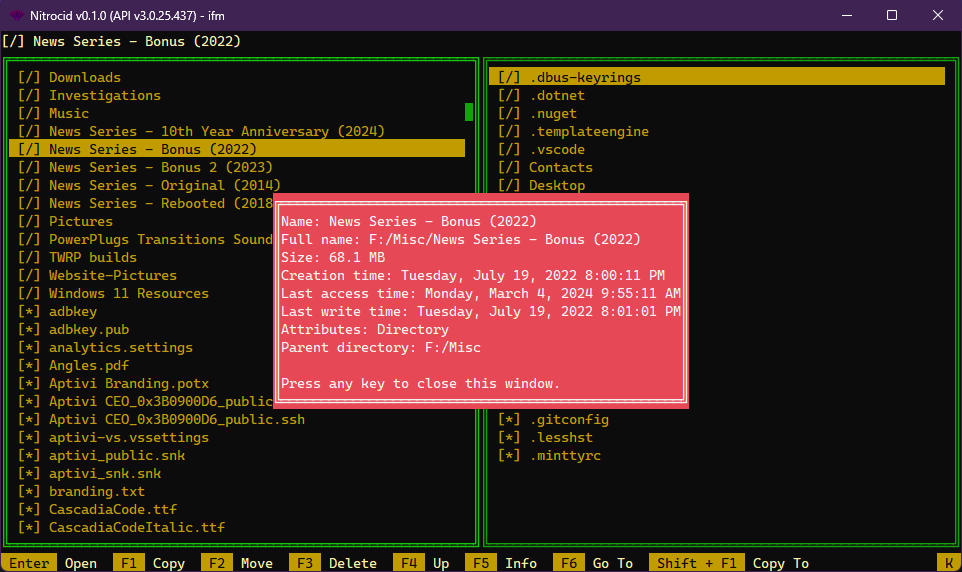 However, if you want to select a directory to navigate to by selecting a directory, you can press F6 to open up another interactive TUI that allows you to navigate to folders and select the desired folder. Pressing Spacebar on a folder causes you to select a folder that you want to open. If you want to open a folder using just a path or if you want to go to another drive, you can use F6 to open an interactive input infobox that allows you to write a full path to a desired directory.