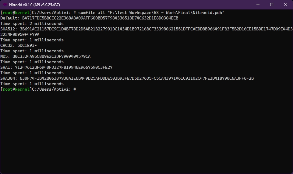 When it comes to verifying the file integrity, the file hashing feature of Nitrocid KS's simulated filesystem comes into play. It features built-in file hashing techniques to allow you to check the sanity of your files. The kernel file encryption features are handled by your selected encryption kernel driver, which can be found here: