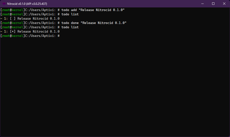 Nitrocid provides you with a single command, todo, that allows you to do the following: