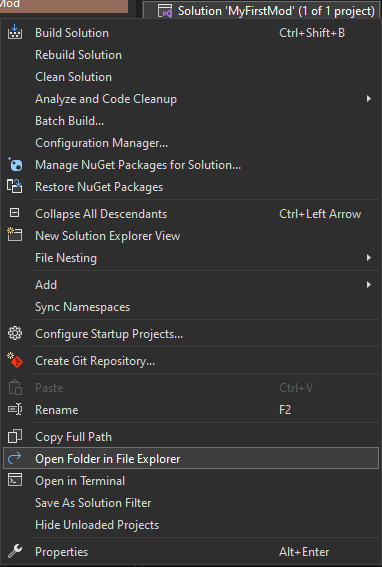 Once the solution is built, open the file explorer to the solution directory by right-clicking on the solution and selecting