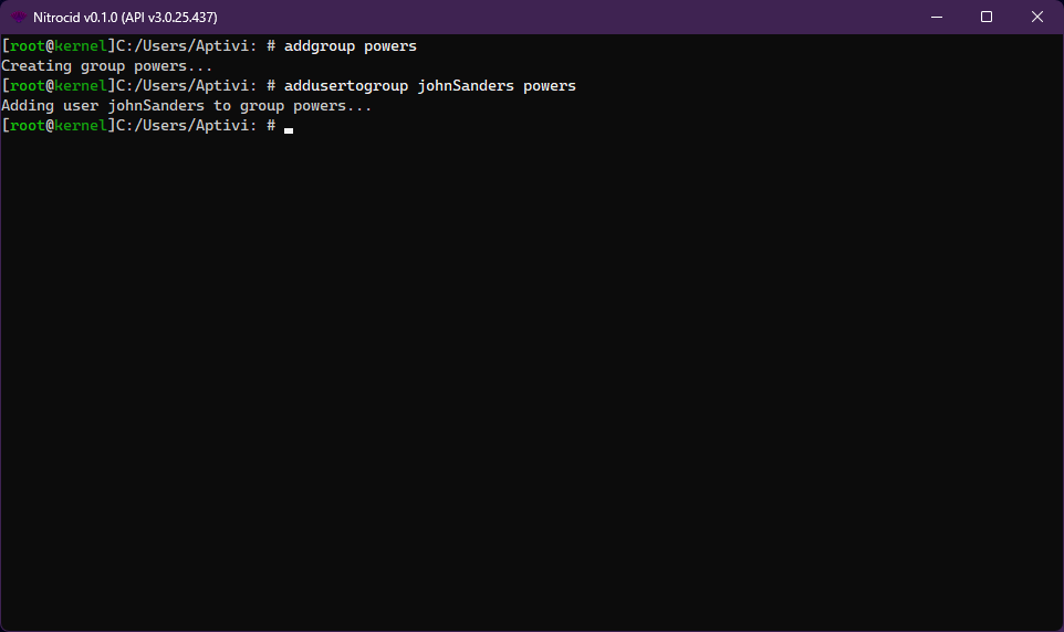 You can add a user to an existing group to organize a user by using the addusertogroup command so that the user gets permissions from the group. You need to specify an existing user and an existing group that the user didn't join to be able to add a user to the group.