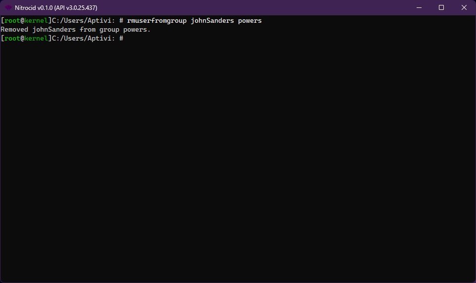 You can remove an unwanted user from an existing group using the rmuserfromgroup command so that the target user is no longer a member of that target group. You need to specify an existing user and an existing group that the user joined to be able to remove a user from the group.