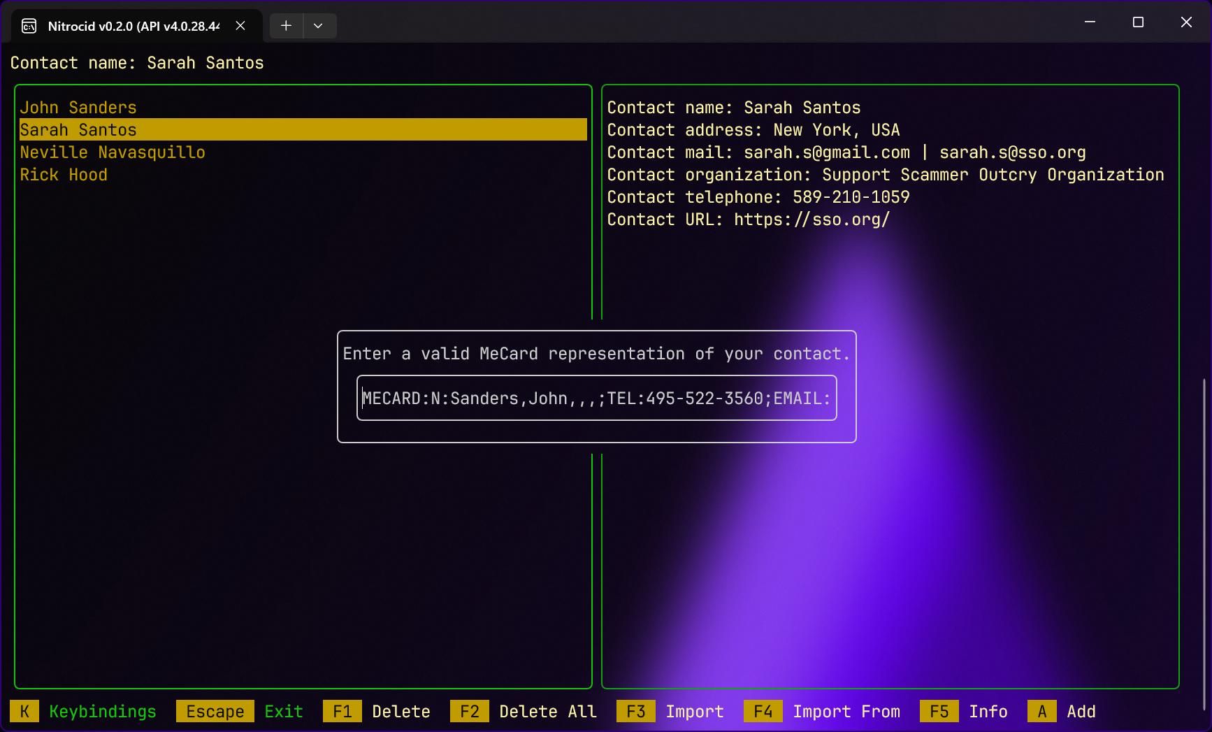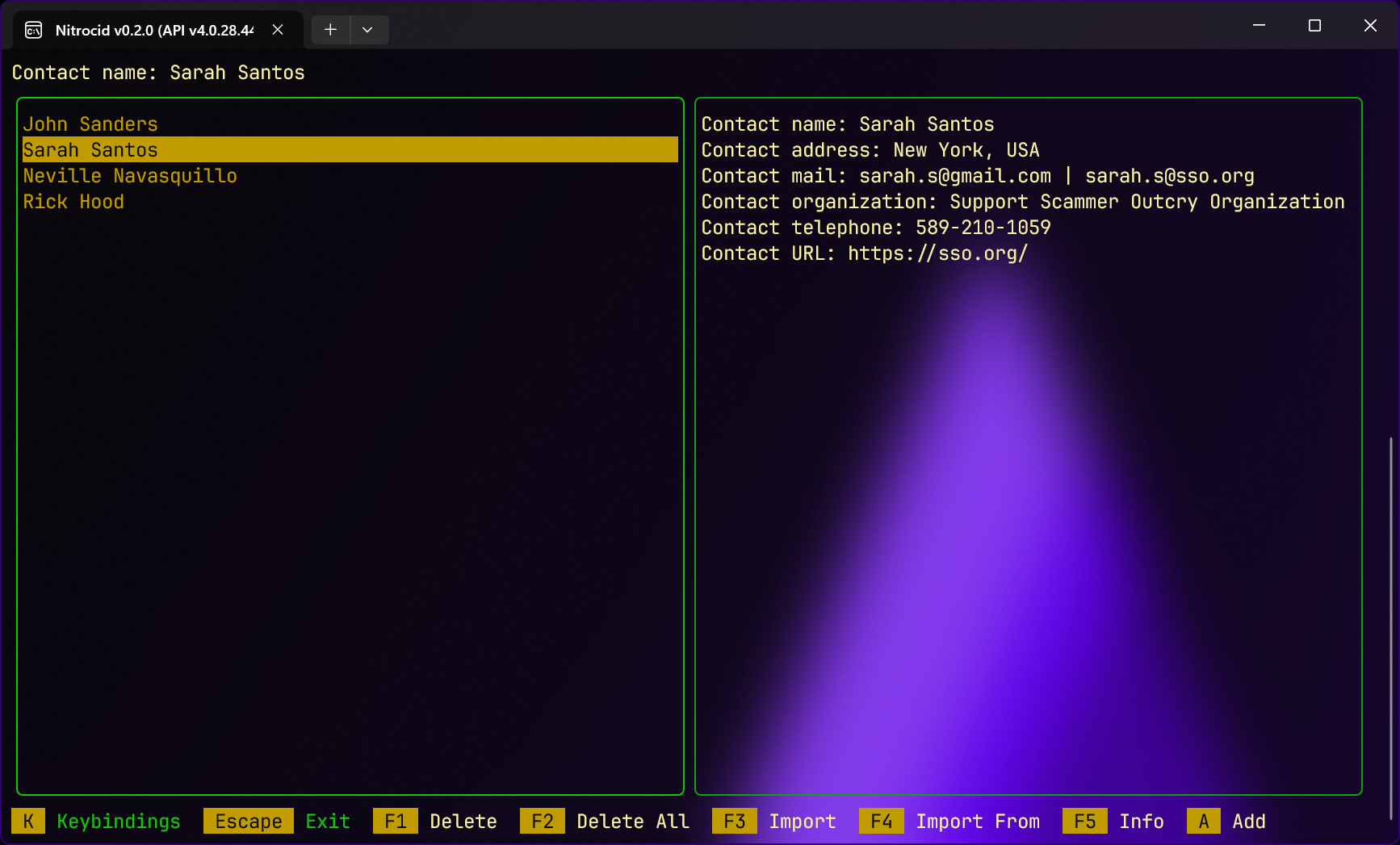 Nitrocid KS, however, has this application as a standalone application and can be executed by invoking the contacts command. You can also perform contact management without the contacts interactive TUI by using one of the following four commands: