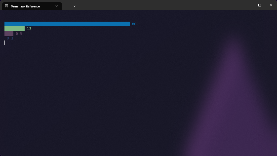 Pie charts visualize data, like all other data charts, but in a pie instead of the usual bars. It uses the values to calculate the arc angles of all elements to then display the whole pie to the console.