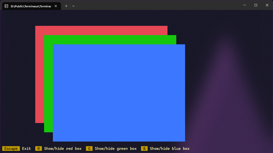 This example provides you with a refreshing interactive TUI showing three boxes, one of which is constantly changing color according to the number of frames rendered, that you can control using the keybindings defined in the constructor of the interactive TUI.