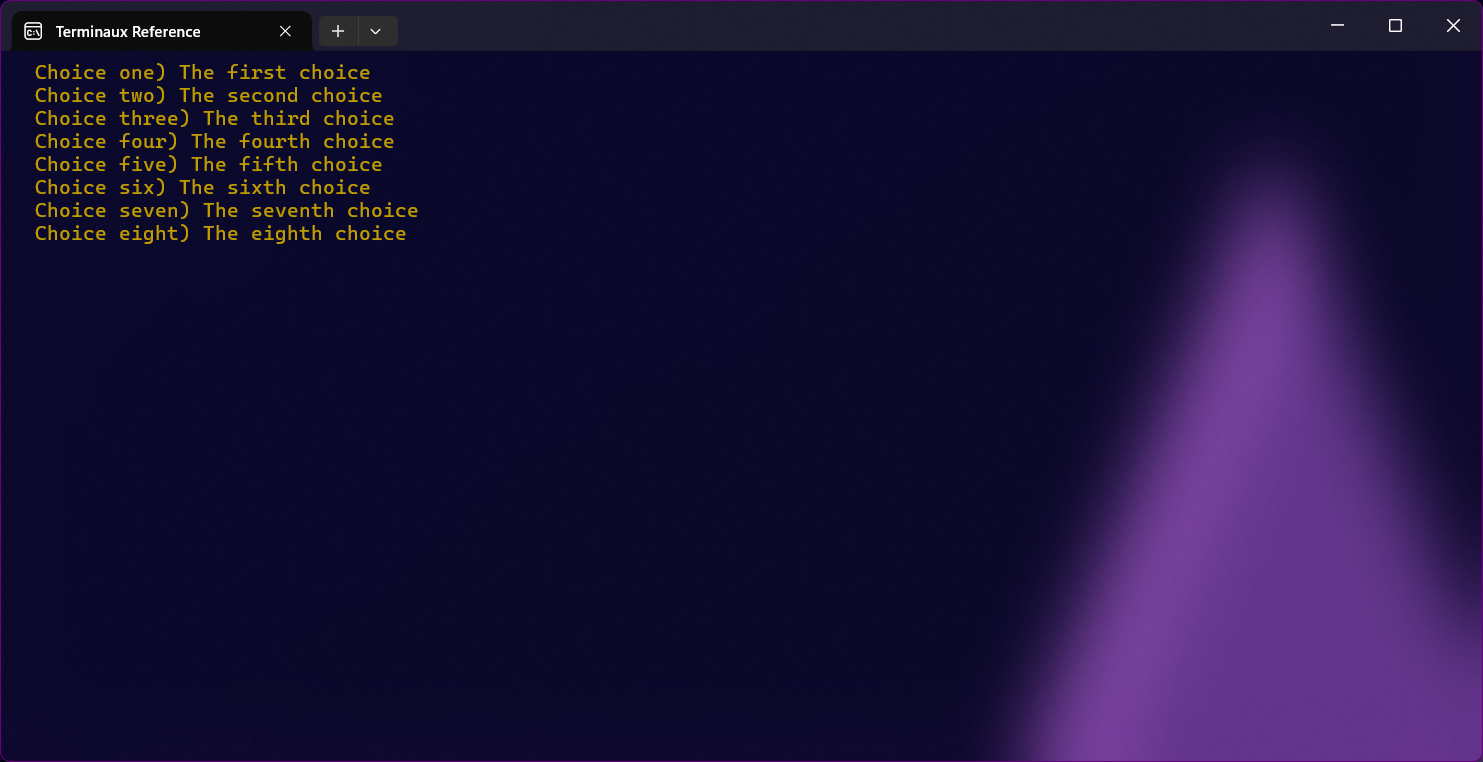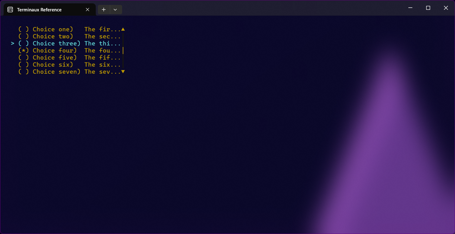 You can render a list of selection elements using this renderable. This renders choices one by one, while still maintaining flexibility of the regular selections, making it suitable for CLIs.