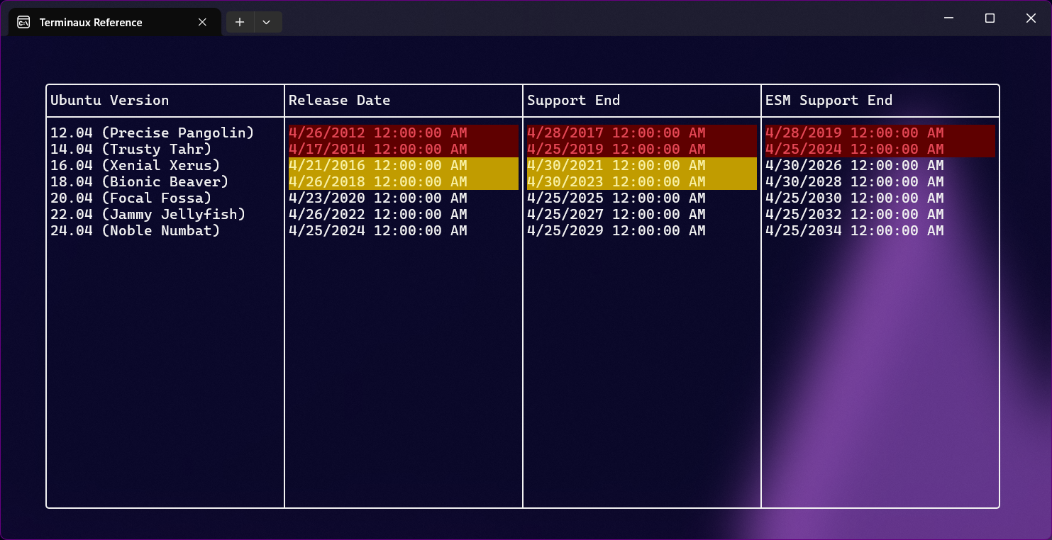 { "Ubuntu Version", "Release Date", "Support End", "ESM Support End" },