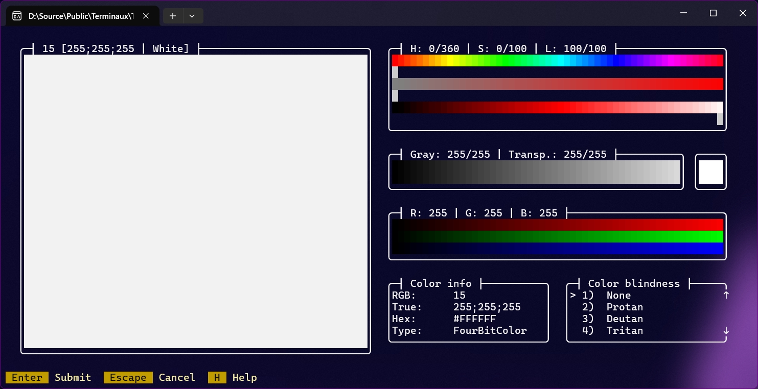 In 256 and 16 colors mode, you can select a color using the right and the left arrow keys. It shows you color information, including the CMYK, HSL, and grayscale values.