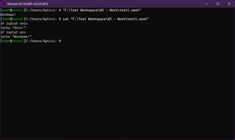 The parser then attempts to skim the script lines for all the variables, and replaces them with the value. The parser also attempts to parse the script argument placeholders, defined with {num}; which num is the argument number, in case the ︎user executed the script with the arguments. For example, this script prints the first argument: