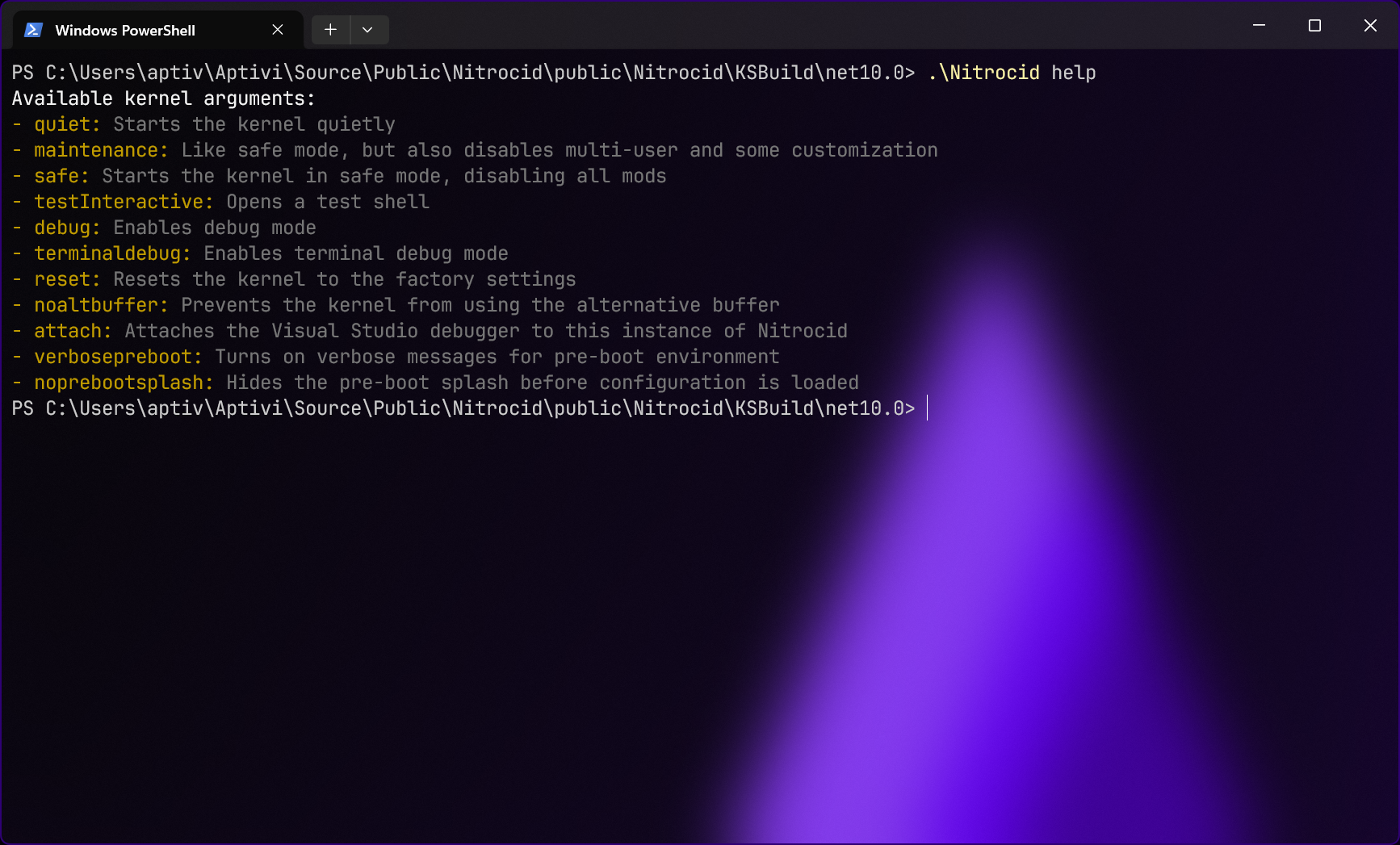 attach: Attaches a Visual Studio debugger to the current instance of the kernel (Windows only)quiet: Starts the kernel quietlymaintenance: Starts the kernel in maintenance mode which behaves like safe mode but with additional features turned offsafe: Starts the kernel in safe mode which disables all modstestInteractive: Opens the interactive test facade selectiondebug: Enables debug modeterminaldebug: Enables terminal debug modereset: Wipes all settings and resets the kernel to factory settingsbypasssizedetection: Bypasses the 80x24 console size detectionnoaltbuffer: Prevents the kernel from using the alternative buffernoprebootsplash: Prevents the kernel from displaying the pre-boot splashlang <lang>: Selects a pre-boot environment languageverbosepreboot: Shows extra pre-boot messages