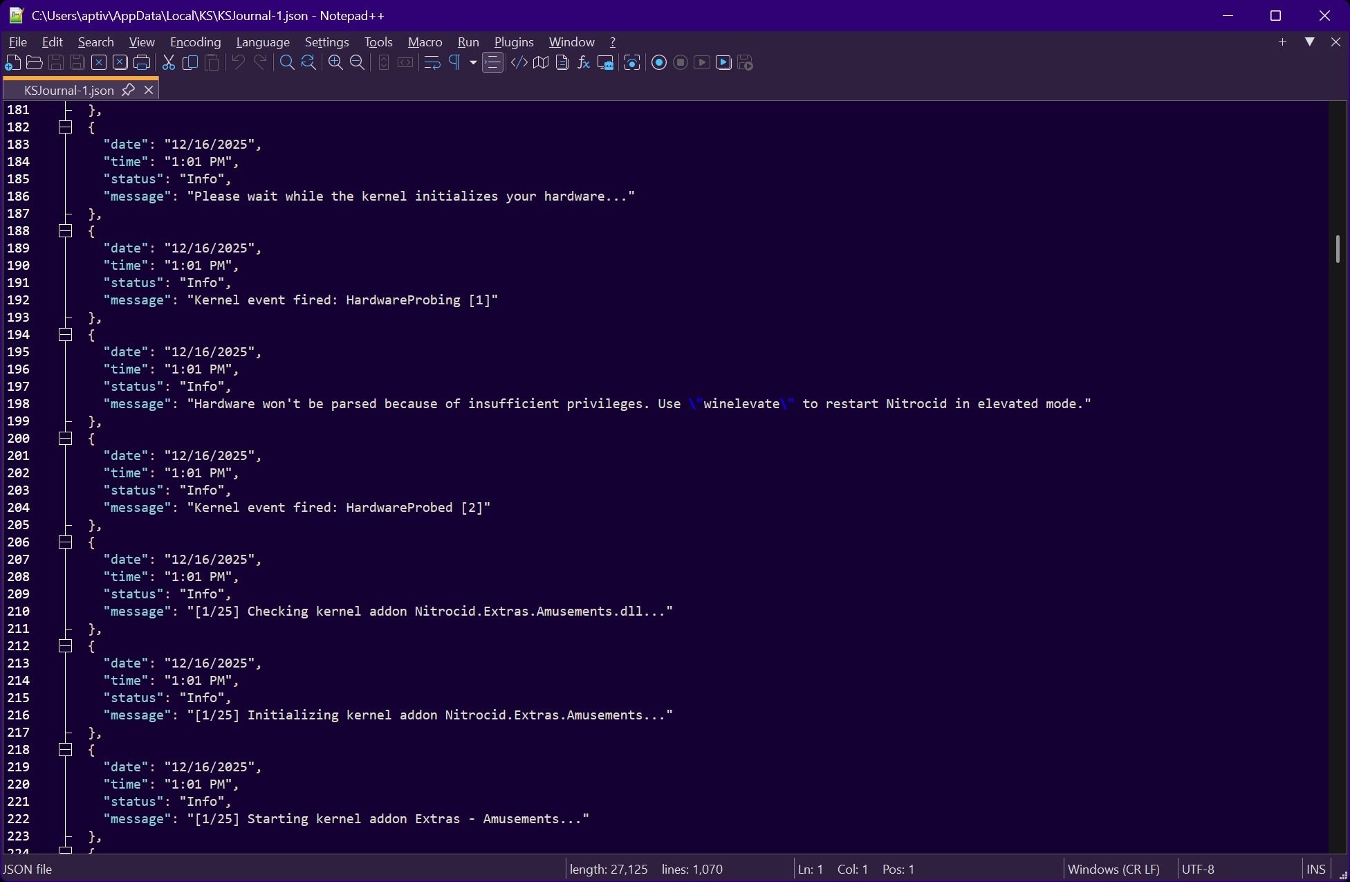Kernel journals are JSON files that tell you how the kernel is going, such as the boot process and raised events. They are serialized to the journal entry class, JournalEntry, which you can get all of the current session's kernel journals by using a function, GetJournalEntries(). Each entry contains the following items: