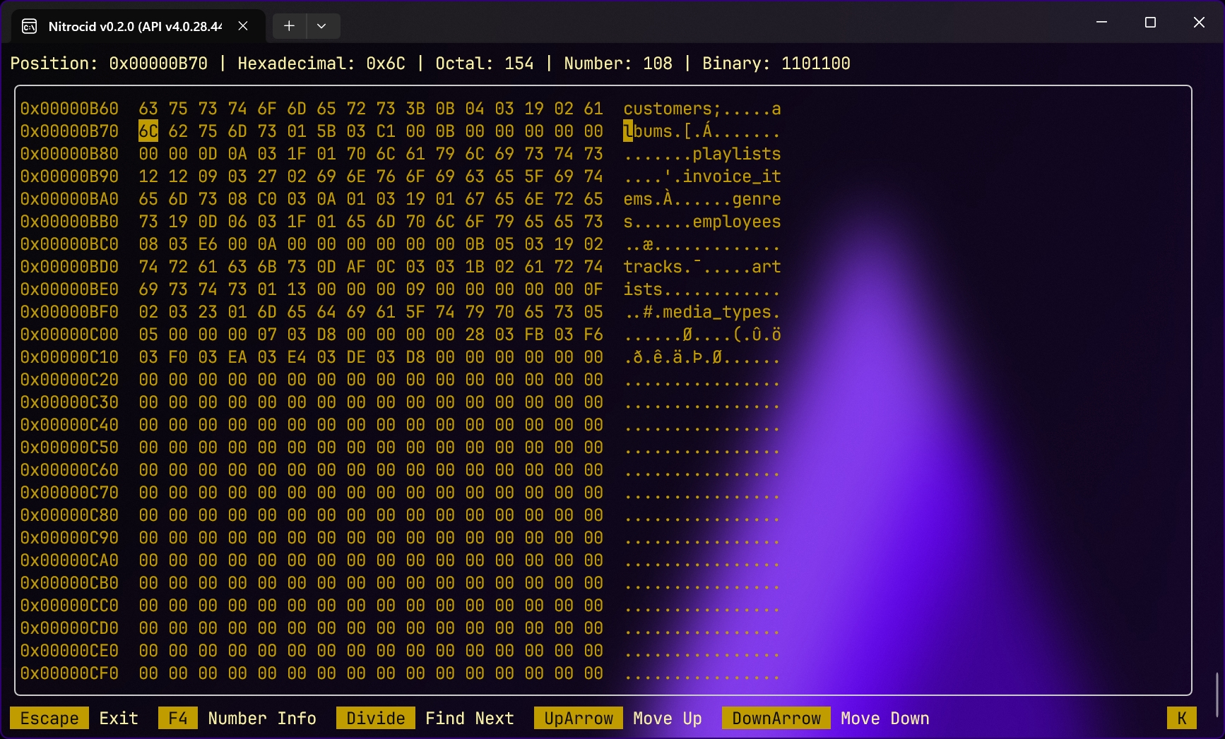 You can also interactively edit SQL files using the powerful interactive TUI for hex editing. You can consult the below page for more information about how to use it: