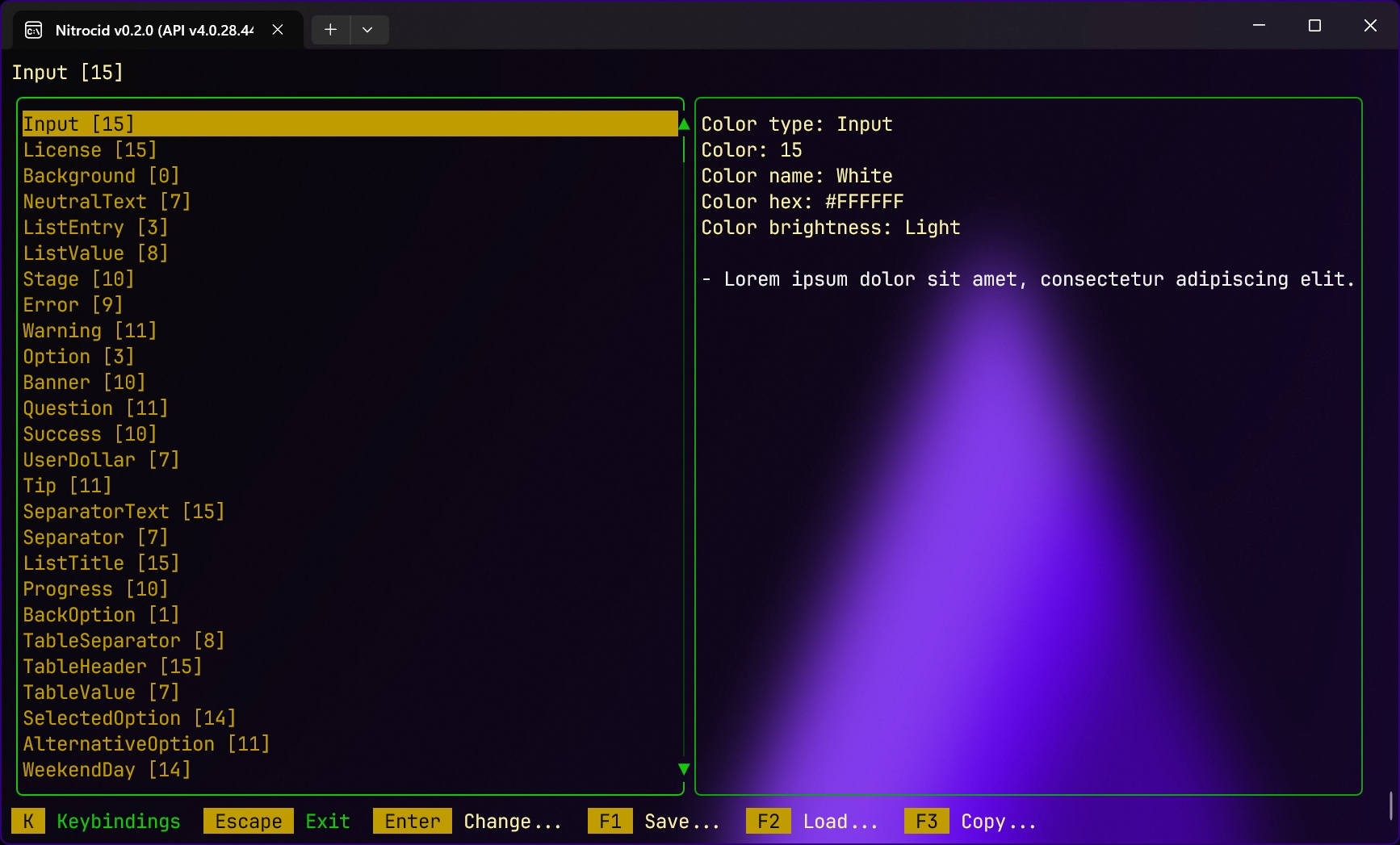Save Theme to Current Directory: Saves the theme file to the current directorySave Theme to Another Directory...: Saves the theme file to a specified directorySave Theme to Current Directory as...: Saves the theme file to the current directory as another nameSave Theme to Another Directory as...: Saves the theme file to a specified directory as another nameLoad Theme From File...: Loads a theme from a theme JSON fileLoad Theme From Prebuilt Themes...: Loads a theme from one of the pre-built themesLoad Current Colors: Loads the current colors and undos any changes made.Preview...: Shows you a live theme preview as list of textExit: Exits the application