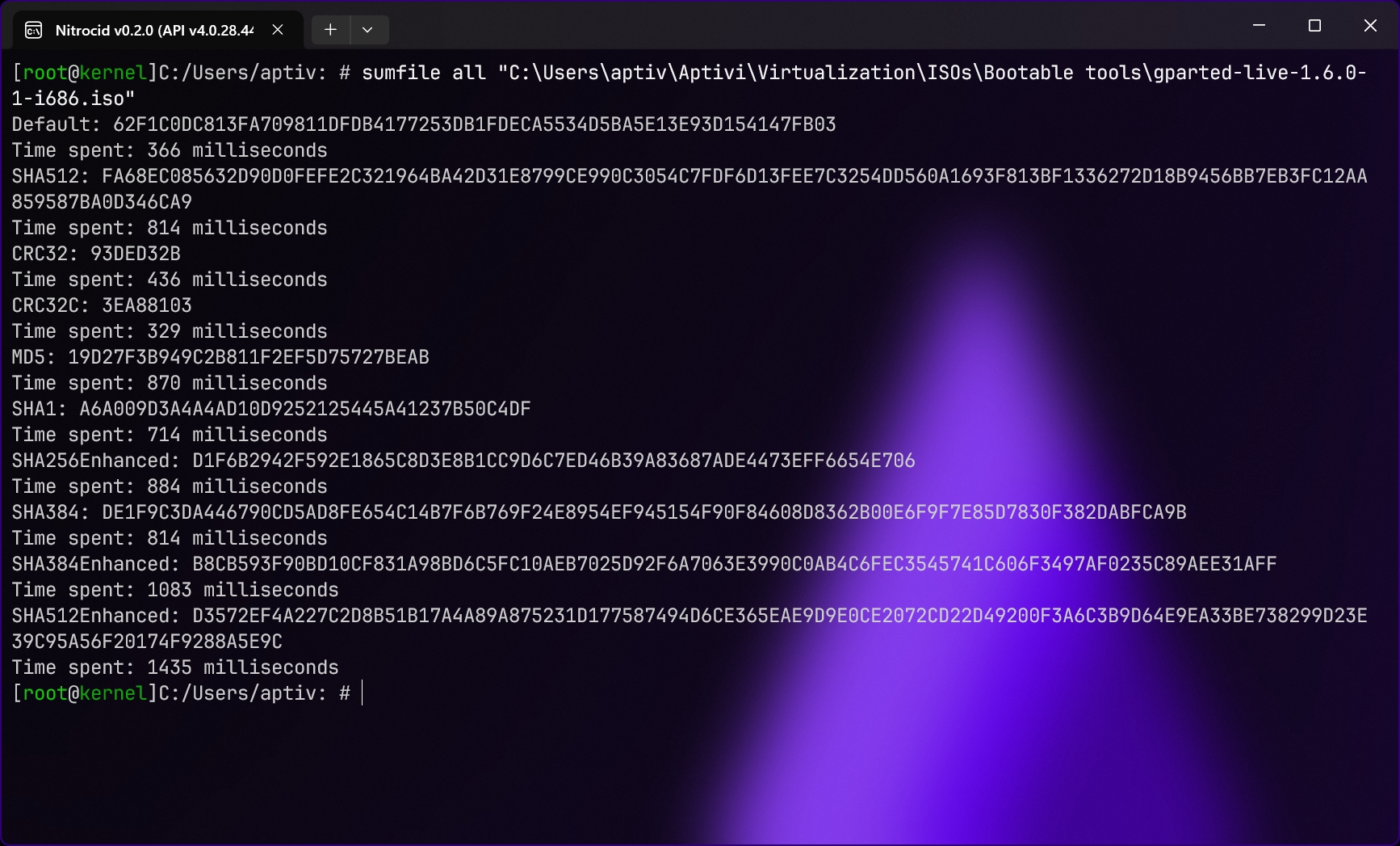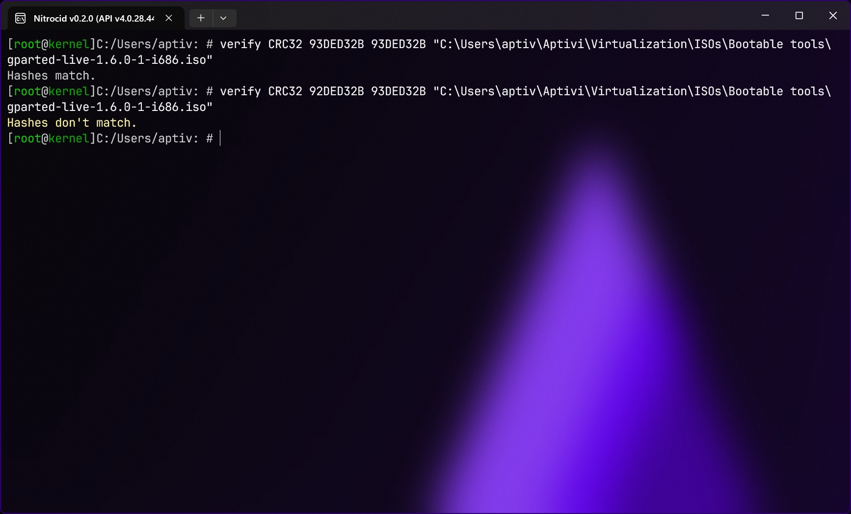 When it comes to verifying the file integrity, the file hashing feature of Nitrocid KS's simulated filesystem comes into play. It features built-in file hashing techniques to allow you to check the sanity of your files. The kernel file encryption features are handled by your selected encryption kernel driver, which can be found here: