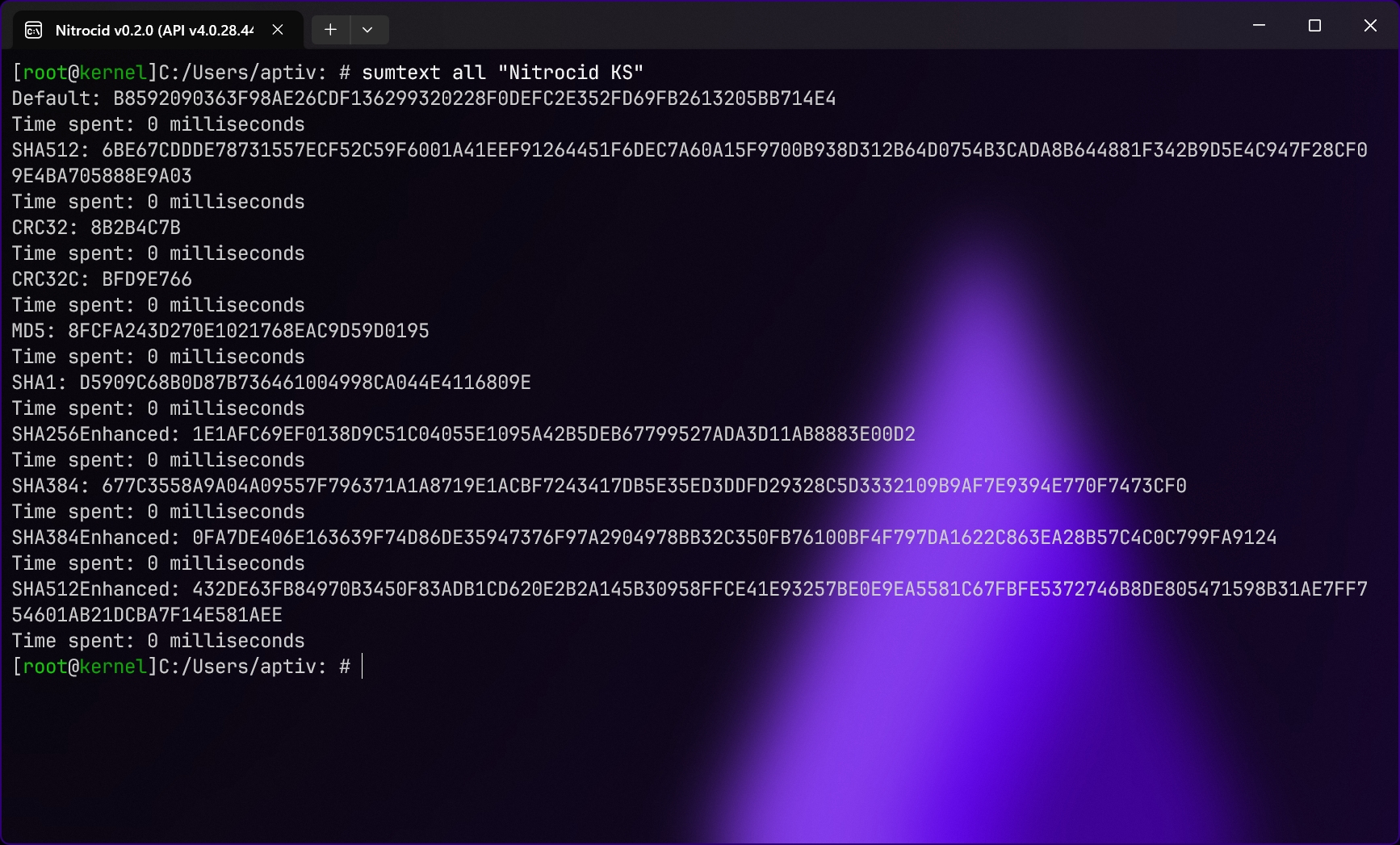 In the HashVerifier class found in the Nitrocid.Drivers.Encryption namespace, you can access the verifier tools to give your mods ability to use the current encryption driver to verify the hash sum of your files and your texts.