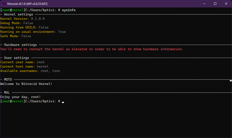 IsOnWindows(): Checks to see if Nitrocid KS is running on Windows.IsOnUnix(): Checks to see if Nitrocid KS is running on Unix and its derivatives, such as Linux, macOS, etc.IsOnMacOS(): Checks to see if Nitrocid KS is running on Darwin Kernel, the kernel behind macOS.IsOnAndroid(): Checks to see if Nitrocid KS is running on Android phones and tablets within Termux.IsOnUnixMusl(): Checks to see if the kernel is running on musl libc library or glibc.