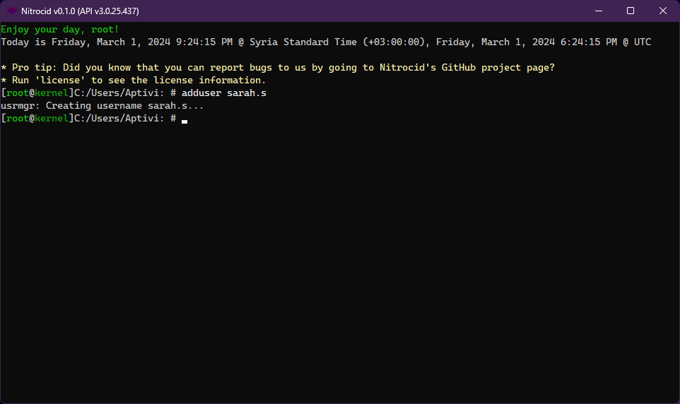 The same thing can be simulated in Nitrocid KS. To add a new user account, follow these steps: