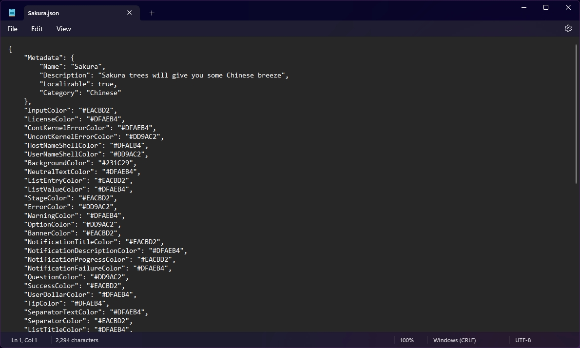 }We'll explain things one by one. The Metadata key consists of some basic information about the theme, like the name and the description. Themes can also be event-based by setting the appropriate property.