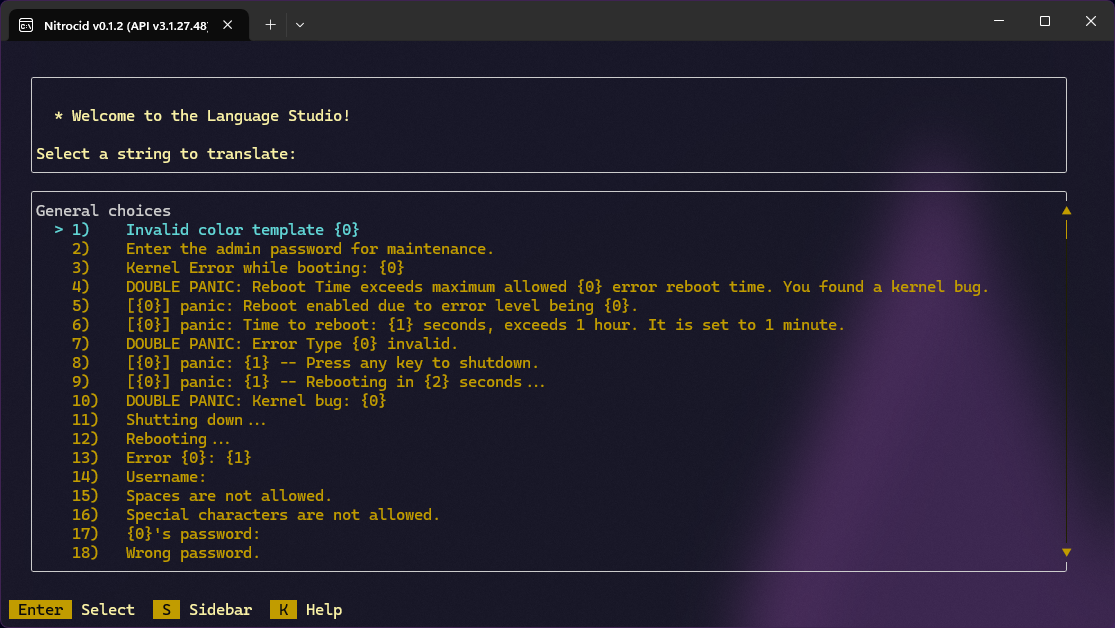 Once you point mklang to a directory containing these files, you'll be taken to a screen that allows you to select an English string to be translated. You can select one of them by moving up or down and pressing ENTER. Then, you'll be provided with a list of languages and their translations like below: