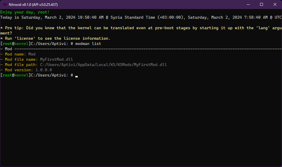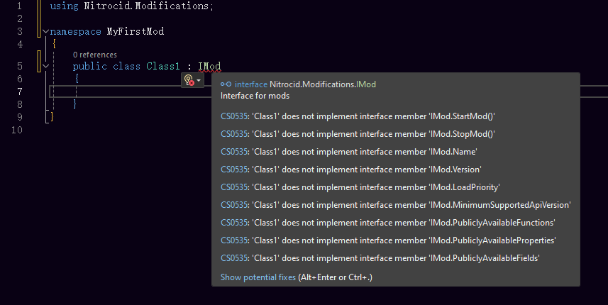 : IModand import the required namespaceby using Nitrocid.Modifications;. You should see errors indicating that you have to implement the methods.
