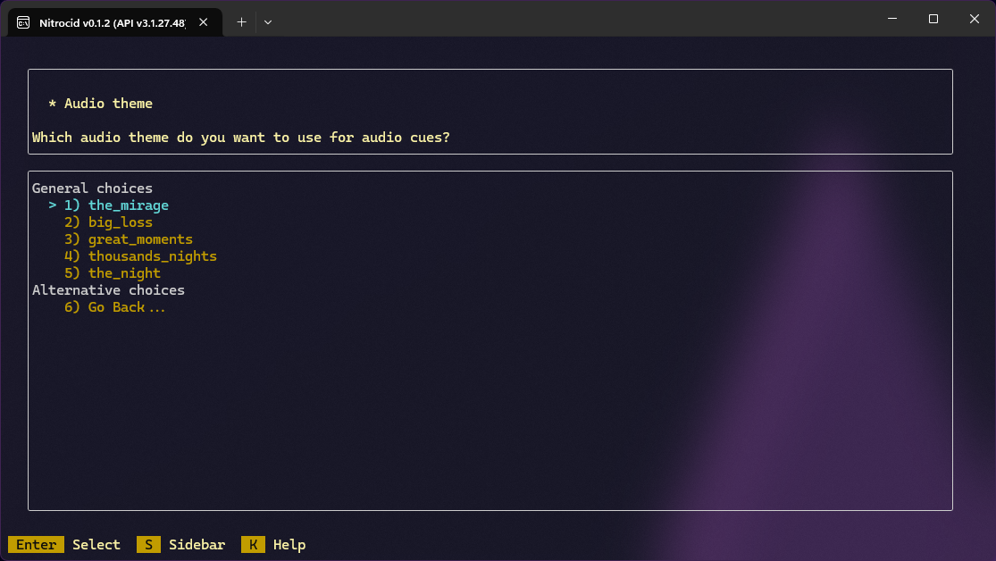 Every audio cue container represents a sound theme, which is managed by the audio cue tools class, AudioCueTools. This class is found in the Nitrocid.Misc.Audio namespace. The following themes can be chosen: