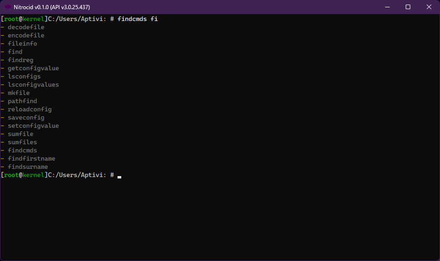 All of the shells contain their own commands that you can review on either the help command list (depending on the mode used, such as -addon for addon commands) or the below page (just for Nitrocid shells, base shell, and Addon commands):