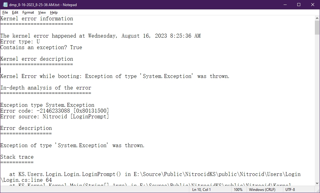 public KernelException(KernelExceptionType exceptionType, string message, Exception e, params object[] vars)Typically, the message displays the exception type, the message, and the exception information. As always, if you believe that it's a bug, make an issue in our GitHub repository.