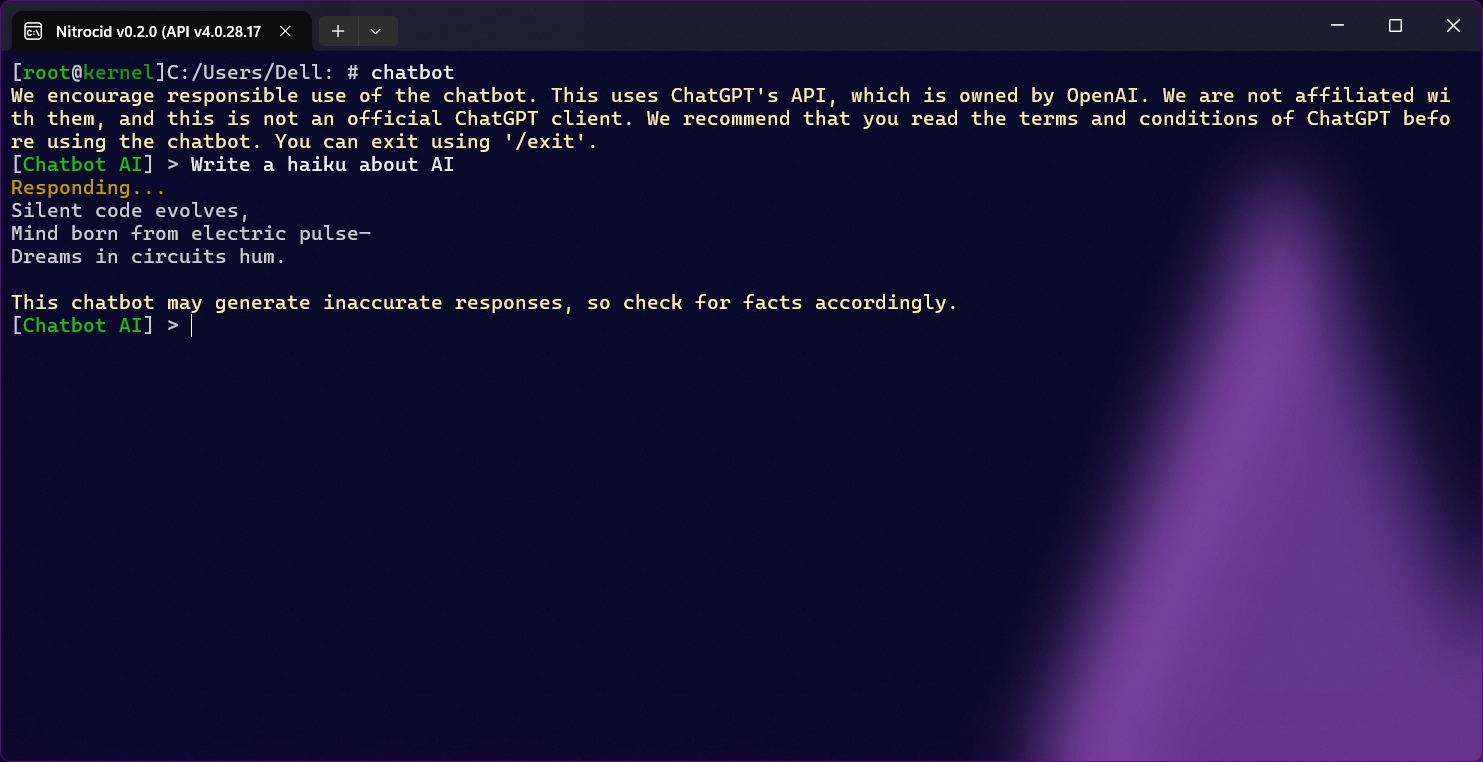 Nitrocid provides you with this chatbot to help you perform tasks on the go, such as writing a haiku, assisting in writing code, and much more. It uses Terminaux's implementation of the shell to ensure that you have a seamless chatting experience, complete with commands that you can execute using the slash command.