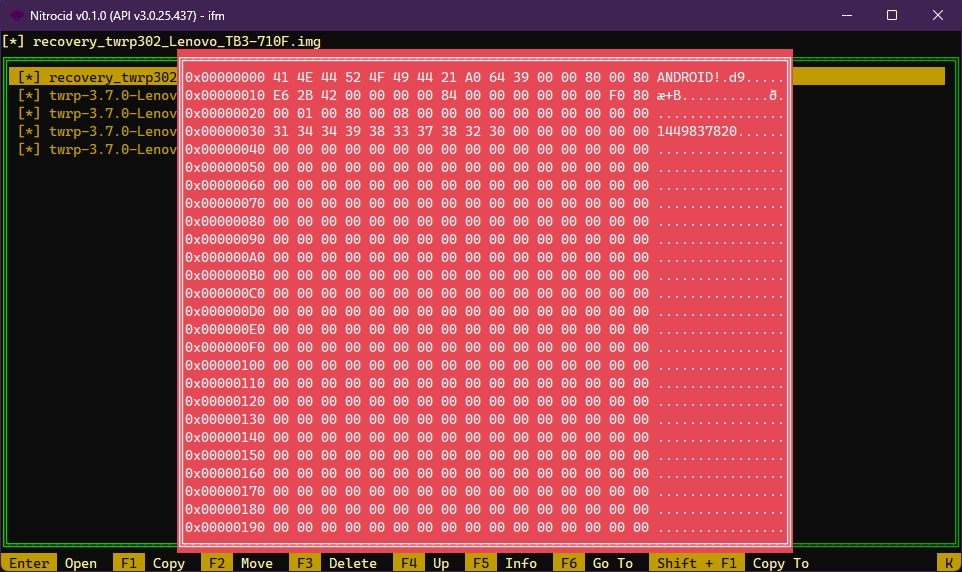 By pressing P, you'll be able to preview either a binary or a text file inside an informational box. You can use UP and DOWN arrows to navigate the file by one line, Page Up and Page Down to navigate by one page, or Q to exit the informational box.