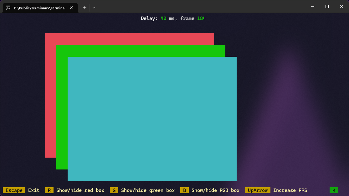 This example provides you with a refreshing interactive TUI showing three boxes, one of which is constantly changing color according to the number of frames rendered, that you can control using the keybindings defined in the constructor of the interactive TUI.