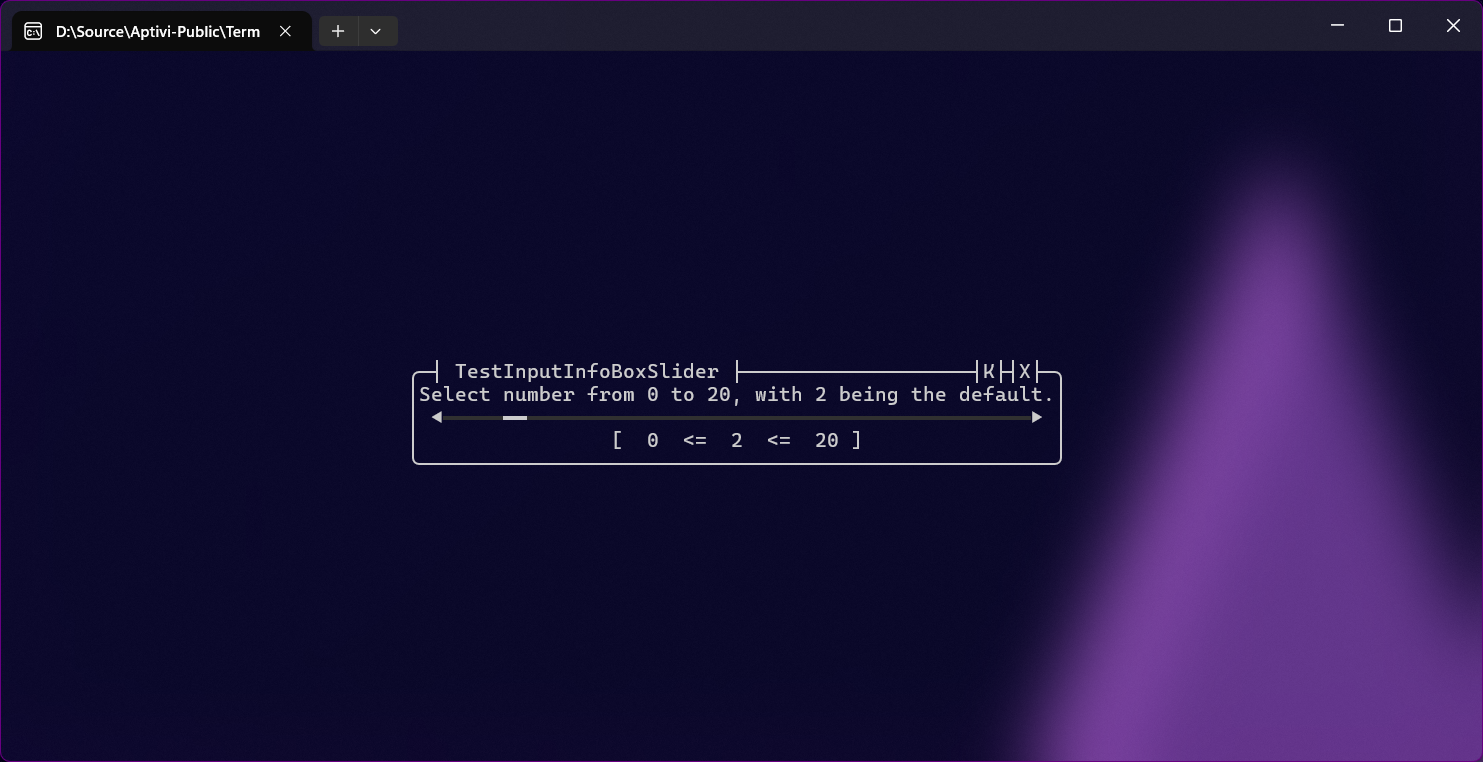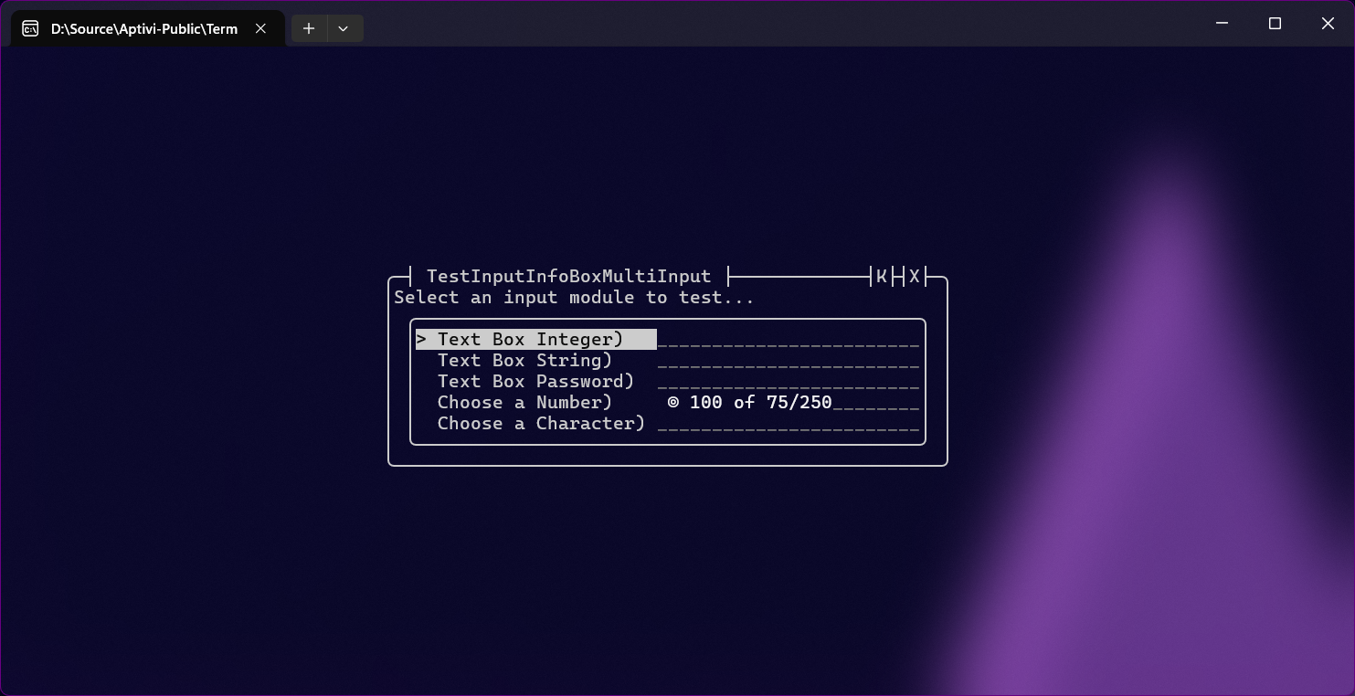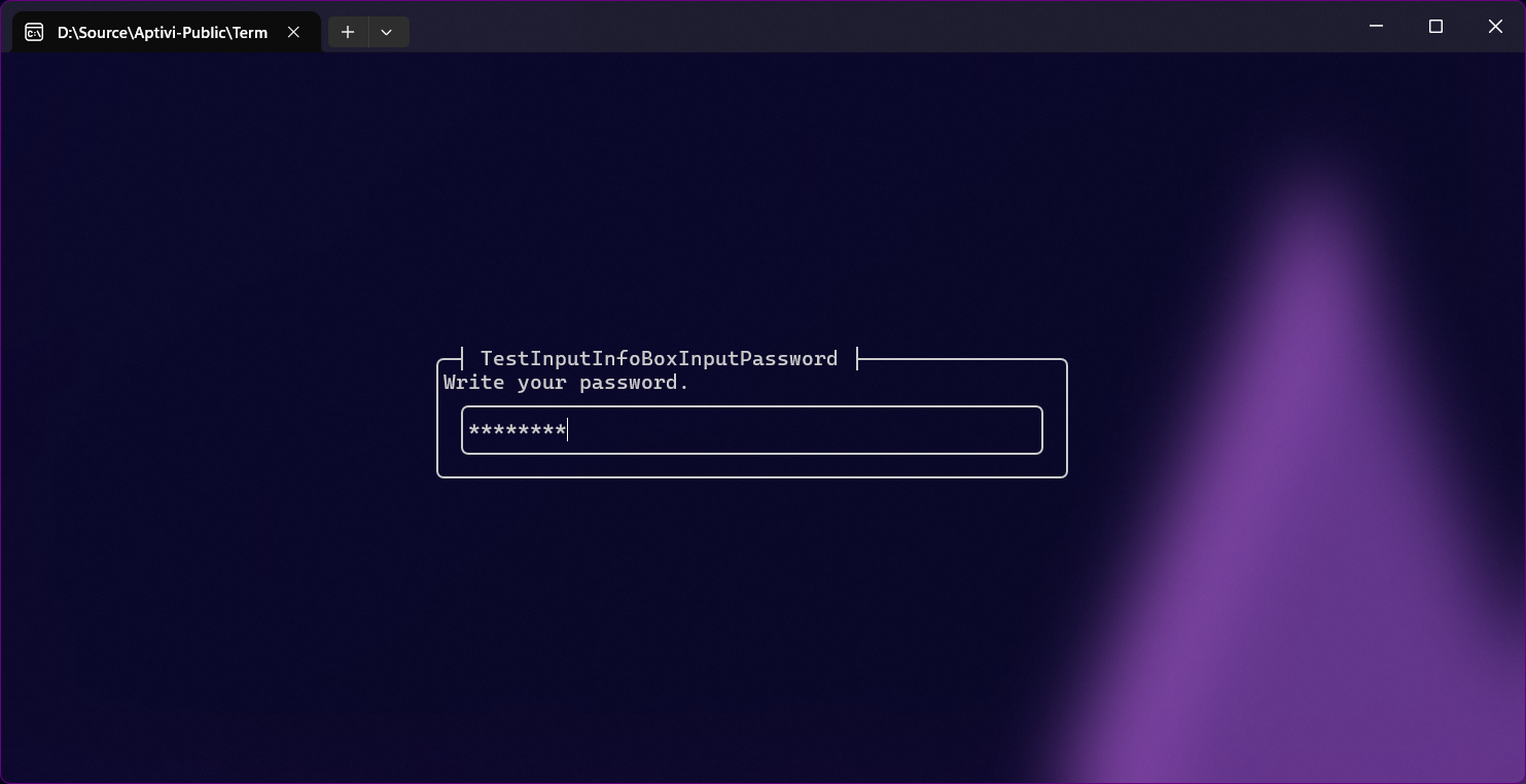 This style uses the input reader that takes the first character from the input string, based on the informational box contents. For example, if this informational box tells an end-user to write a character to specify a box border character, the user will have to write it. You can use this style with InfoBoxInputColor with specifying the InfoBoxInputType as Character.